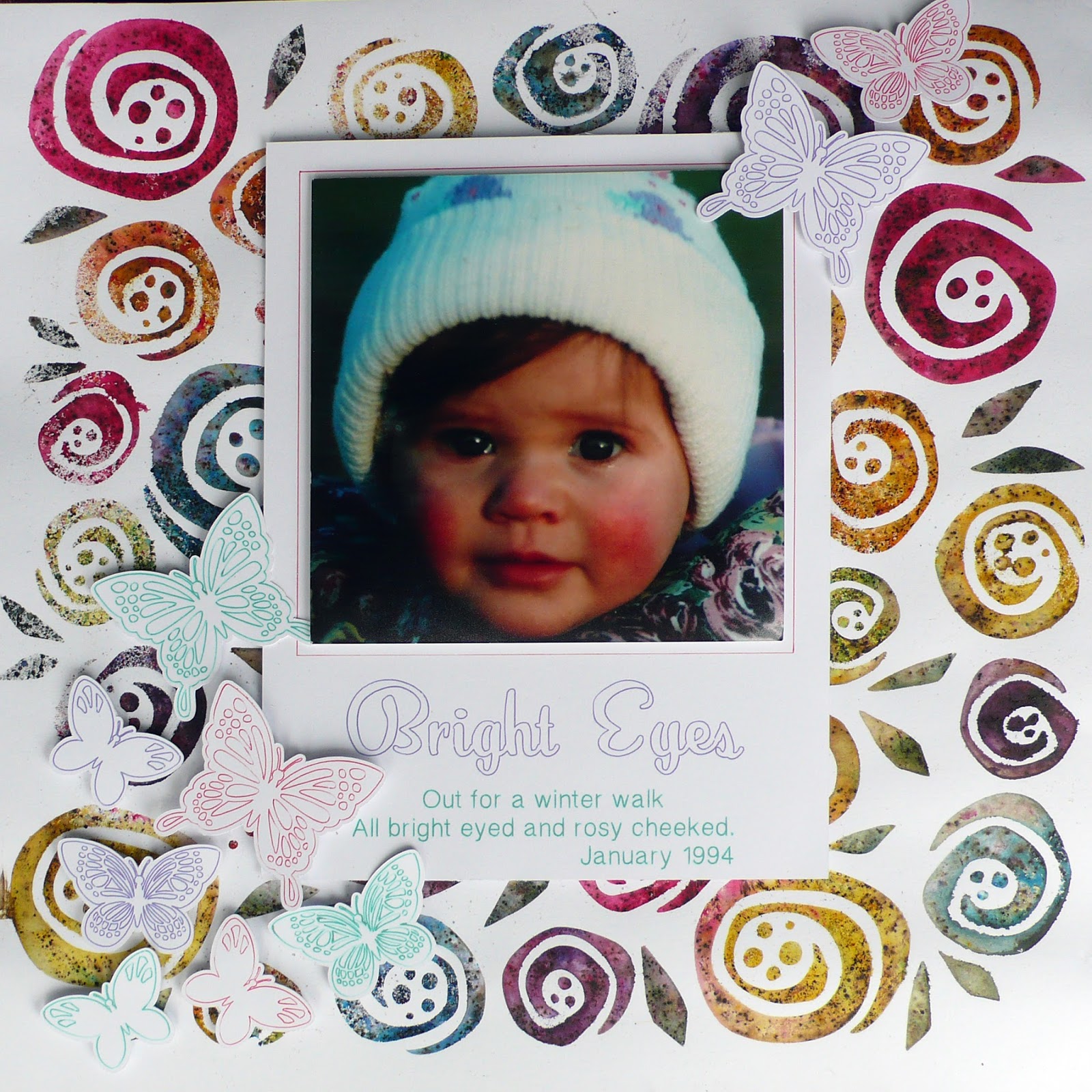 - Next, I thought I would try some texture paste so I coloured a piece of gloss resist card with a distress ink pad. Cut an arabesque shape, sprayed the back with temporary adhesive, placed on my page and used a spatula to smooth the paste through the holes. Again I was very pleased with the results.