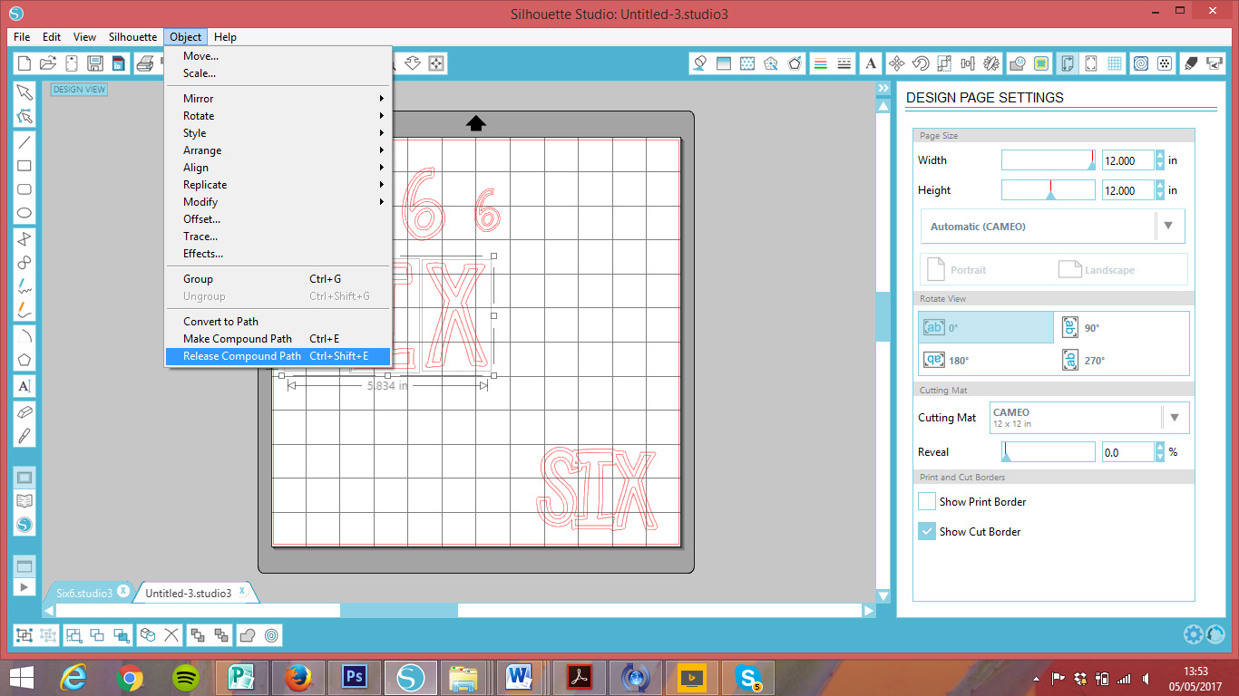 At this point I had all my outlines cut and I wanted to create and cut all the filled bits for the middles. I selected the letters and released the compound path so that all bits were separate