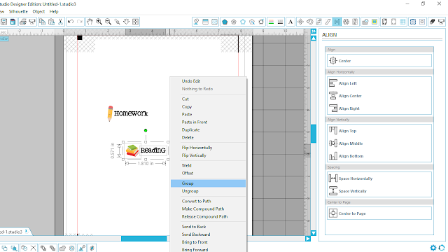 Delete all of the elements that you will not use (I kept the pencil and the stack of books). Using the text tool, select a font and write Homework and Reading. Resize the wording and pictures and select no cut in the cut settings